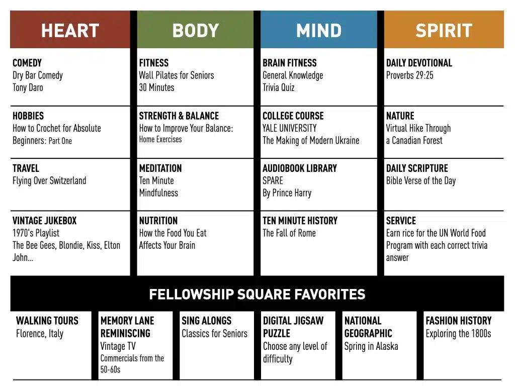 Everyone wants to live their best life. Optimal well-being is a holistic endeavor that involves nurturing our heart, body, mind, and spirit. At Fellowship Square-Mesa, we are committed to fostering this balance for our residents. Our comprehensive wellness program includes a wide variety of in-person activities as well as a virtual, on-demand wellness portal. This helpful tool provides the flexibility for residents to pursue their path to wellness at any time and from any location. From virtual globetrotting adventures to stimulating brain fitness puzzles, live concerts spanning decades, enlightening college-level lectures, specialized yoga sessions, and much more, there’s something for everyone to enjoy.